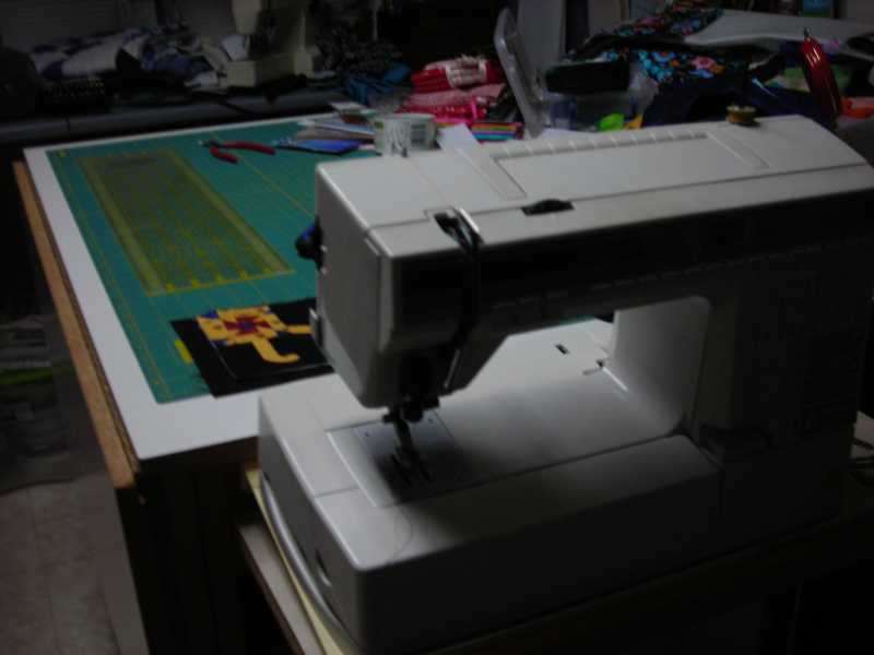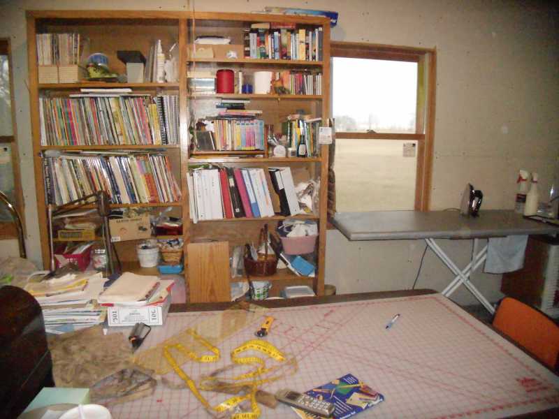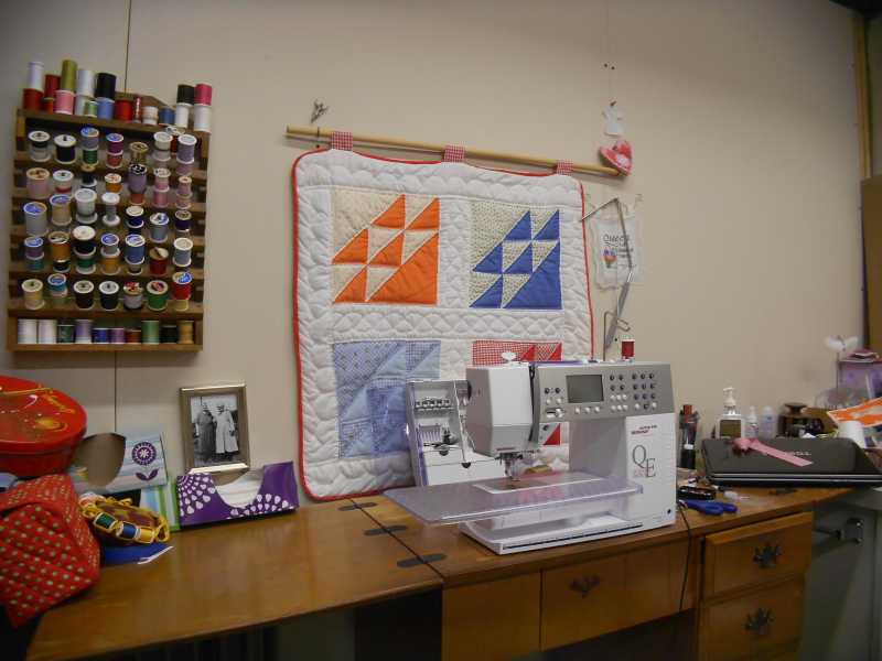 Here is my bookcase with cutting table in front and ironing surface to the right.