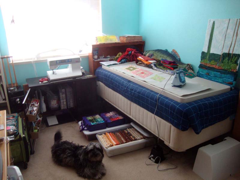 Here are the post organization photos of my [strike]son's[/strike] sewing room. The bed is on risers and a table is on top making a good counter height to iron and cut fabric. Wad of fabric in corner waiting to be ironed and put away. I washed my entire stash and just folded most of it without ironing, but this fabric came out very wrinkled (Kaffe Fasset's shot cotton, very pretty colors).