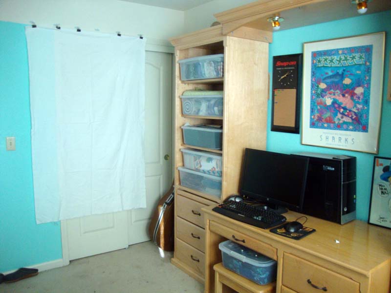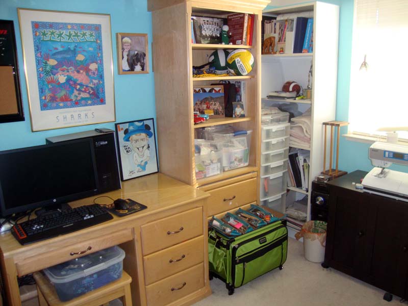 On the opposite wall is the desk and bookcases. Two shelves remain as reminder of son, the shelf under those have two bins for magazines, books and patterns. Bookcase on the other side has plastic bins for more fabric storage. Couldn't use the closet, because it is stuffed with son's stuff. I imagine when he gets a permanent station, he will take most of it (a lot of camping and backpacking gear). Hung a length of white flannel over closet as a design wall.