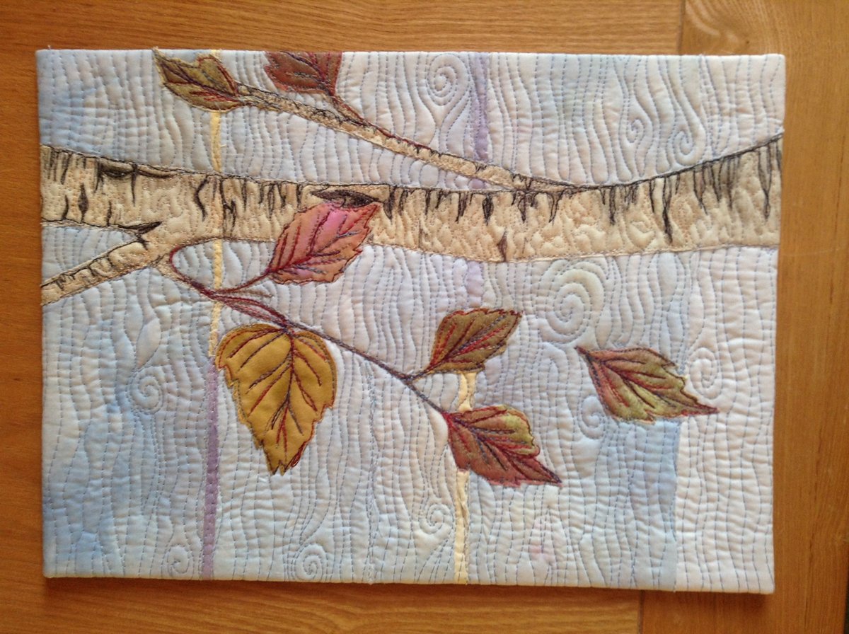 It's raw edge appliqué with the leaves (except 2) printed on some hand dye cotton with metallic paint then cut round leaf shape and bondawebbed on. The stitched branch bunched the fabric so I had to cut a section out :roll: