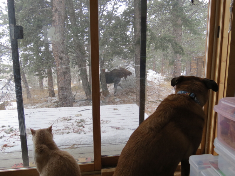 I've lived up here for 15 years and this was the first time I've seen moose in my yard. I'm sure they've been here, but I haven't gotten to see them. There were two this morning, both males who have dropped their antlers. We hung out together for over an hour before they got spooked and ran off. How exciting!!