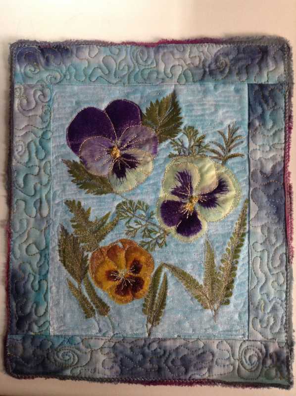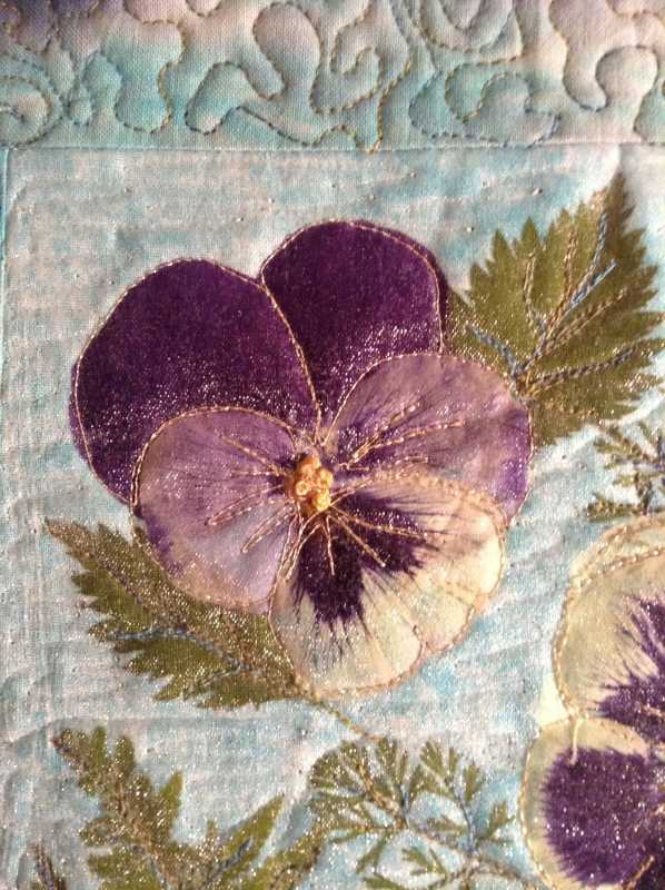 Wendy, It's beautiful. Lovely interpretation of Secret Garden. I love, love, love pansies and purple are my favorite. I am so curious about the technique. I am not familiar with bond a web, but I am thinking that involves heat. If so, I am surprised that did not deteriorate the color immediately. I'd be tempted to do more and experiement with more thread painting using the natural flower coloration as a guide. That way when the natural color from the flower fades you still have the thread color. Just a "what if".