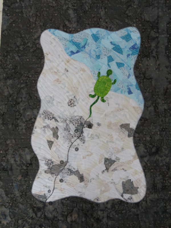 Hi LuAnn - It's actually supposed to be in Antarctica, so it is water and snow rather than sand (not important, but thought I'd mention that). The snow and water aren't actually pieced. Instead, I chopped up some fabrics into small pieces and set them on the fusible side of some heavyweight fusible interfacing, and then ironed them in place, gluing some pieces that were small or overlapped others too much. Then put tulle on top and stitched the fabric in place. You can see the details of what I did on my blog. There's a link in my original post, but I should probably test it to make sure that it works.