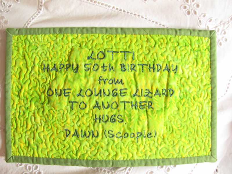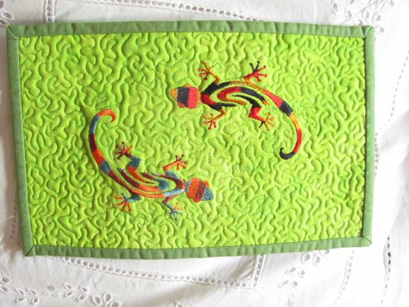 The trick with a two sided mug rug, is how to quilt it! So I quilted the lizard side onto the batting first, in only the lizard area. Then marked out the lizard area on the lettered side, and quilting the rest. Hard to explain, but it worked pretty good. I had fun with this, learned a few things with my new machine, and actually made something in a weekend! :whistle: