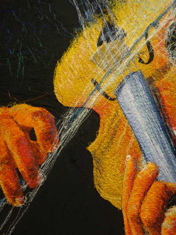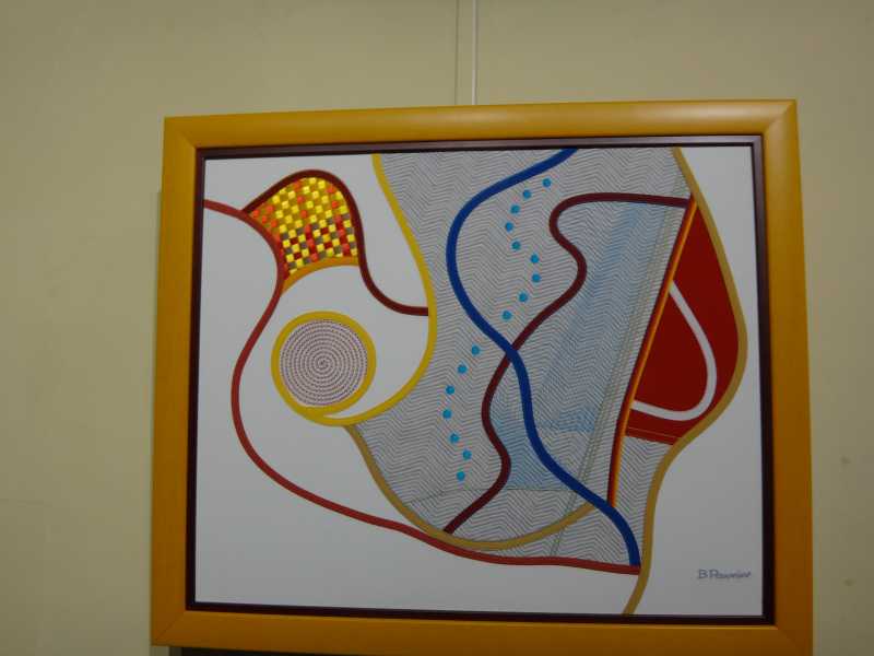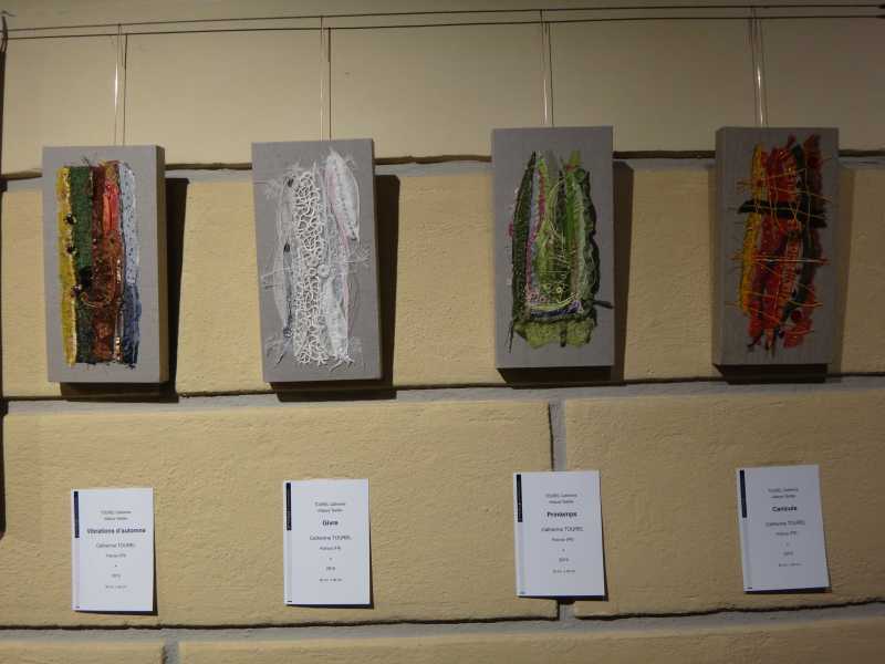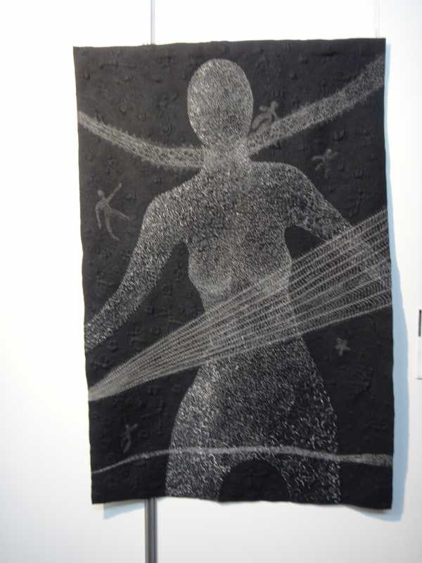 Also at this venue Brigitte Paumier (France) had an exhibit of her work called "The Dot, the line and the Play of Shapes". LOVED IT!! Brigitte stages her textile writing and creates her abstract works by juggling with all kinds of dots and lines. She cuts fabrics free-hand, tears her photos up and sews them, (I don't have any pictures of the ones with photos in them), uses her sewing machine like a paintbrush and her threads like color paints. The drawing of a line made of successive points creates movement on the fabric and gives her patterns sparkle and life with a strong and stirring spontaneity.