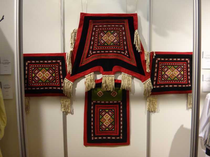 The Republic of Sahka (Yakutia) represents 1/5 of Russia. Most of Yakutia is located in the permafrost. Because of this, Yakut people worship horses and consider them sacred. This is why horse trappings are made by the best craftsmen. Yakut patchwork is handmade using a unique technique “kybytyy´(katirovanie). The ancient craftsmen combined different colors and textures in the making of national costumes. Nowadays, many modern craftsmen continue this tradition. They use a variety of texture and color: fur, cloth, jacquard, rovduga (moose or deer hides), beads, metal and others.