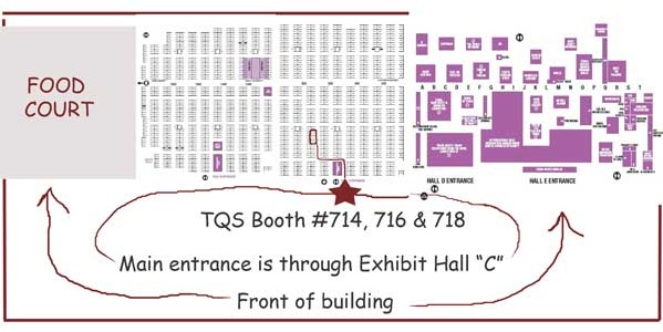 When you enter the show floor look up towards the ceiling near the center of the room and you will see LARGE numbered signs which designate the row numbers. Head for row # 700. The booths are all numbered and you are looking for the TQS booth (714, 716 & 718) on your left, which I have circled in red.