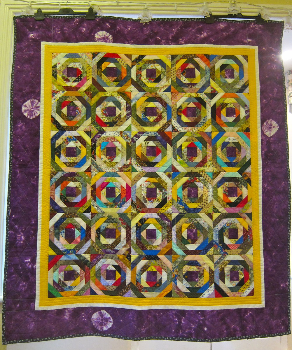 Your quilt is GORGEOUS! In particular, what I love about it is the overall joyousness of the colors and how the yellows, gold, and greenish gold blends so beautifully with the transition to greens. The oranges and what looks like fuchsia make the overall design pop and the blues complement the greens in their calm. The purple centres call out to the border and then in such a pleasant surprise, the occasional muted circles in the border fabric twinkle against the deep purple sky. I love the quilting because it enhances the piece without overpowering it. Beautiful quilt, lucky recipient. Thanks for sharing!!!