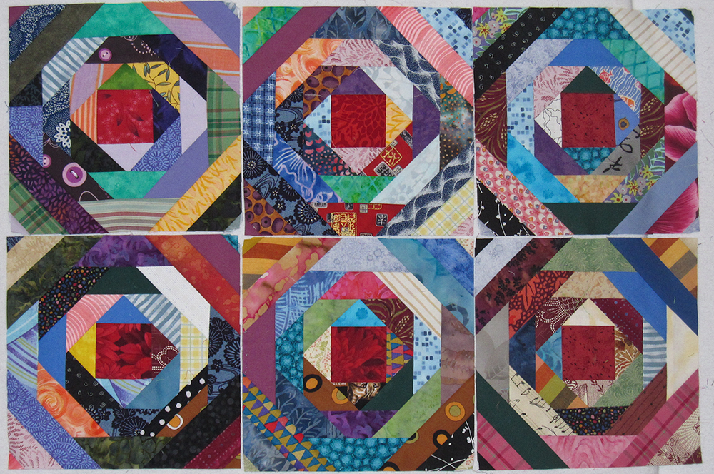 Here are 6 blocks, pretty good so far! It's fun after finishing up the BOM because it's not very exacting sewing. The ruler takes care of any irregularities :shock: of which I have a few. Here's a pic: