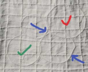 In the photo (which I hope will show up here, I have attached it), the two circles with the blue arrows show you what happened. This shows the back of the little quilt. Both those flat sides were on the final arc of the circle. The circle with the green check mark in it was the third attempt, and turned out better, but only with great effort at smoothing out that humping toward the center. The circle with the red check mark was done with the walking foot alone, along a marked line, with no circular attachment. The red one is about as good as the green one, with a whole lot less stress.