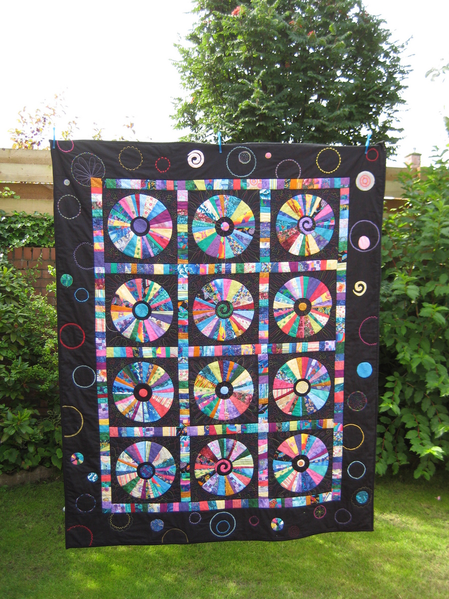 I'm going to stick another picture in here, because it's sort of hard to explain. The circles are fused on to the background, which is a convergence quilt that didn't turn out to suit me. So there are lots of seams beneath those circles. Combined with the fusing, the circles are pretty stiff already. I don't think starch is going to make much difference - unless I starch the back?