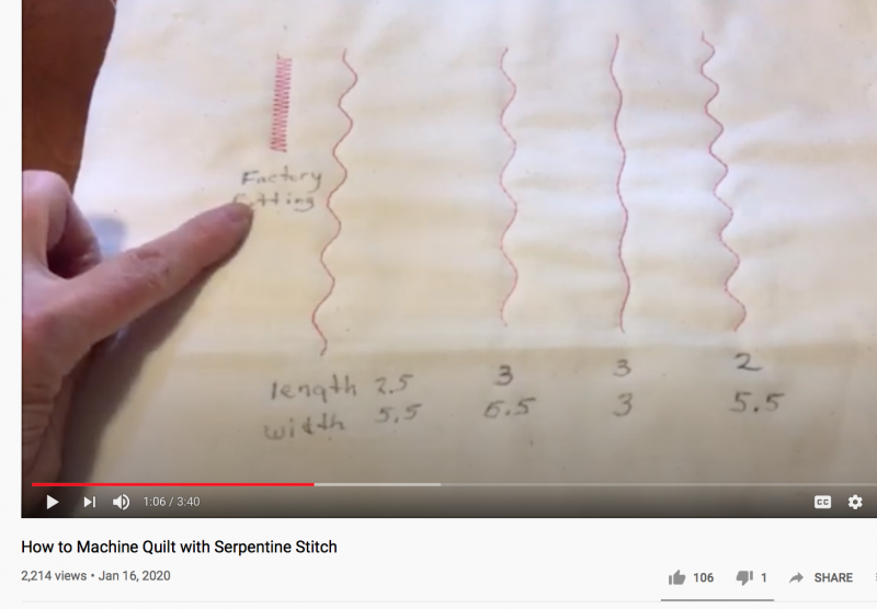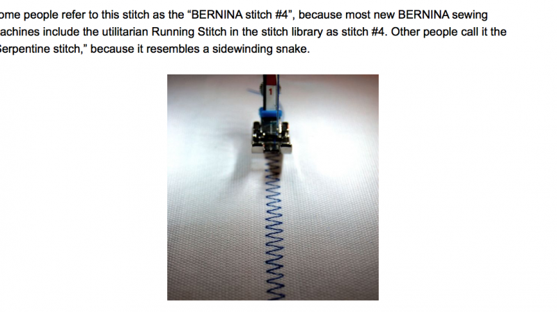 I have a Bernina 150 Virtuosa QE, which has quite a few stitches, but not a serpentine stitch. I've seen a couple of machine quilting videos suggesting this as a more interesting but easy substitute for plain straight line stitching. Does anyone know a way to fidde with the built-in stitches to make the 150 produce a stitch similar to the serpentine? I tried lengthening the running stitch (#4) to do this, but the individual stitches are pretty big and I'm afraid they'll get pulled with using and washing the quilt.Tags: None