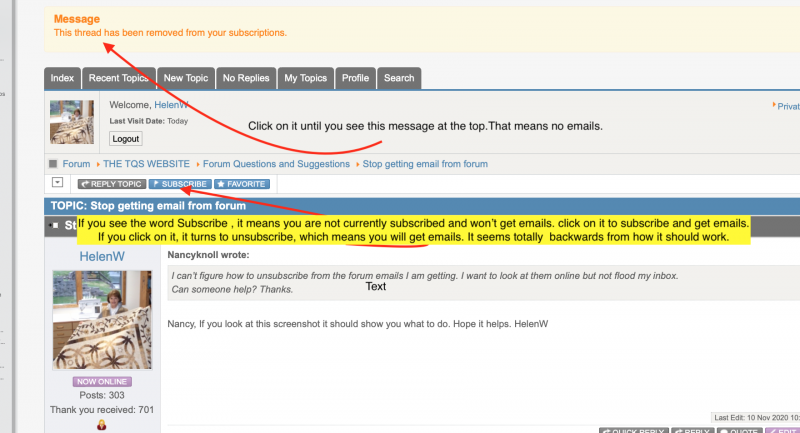 Nancy, If you look at this screenshot it should show you what to do. This is harder to explain than I thought, but also, every time you post you will get a littleOriginally posted by "Nancyknoll" post=150984I can’t figure how to unsubscribe from the forum emails I am getting. I want to look at them online but not flood my inbox.