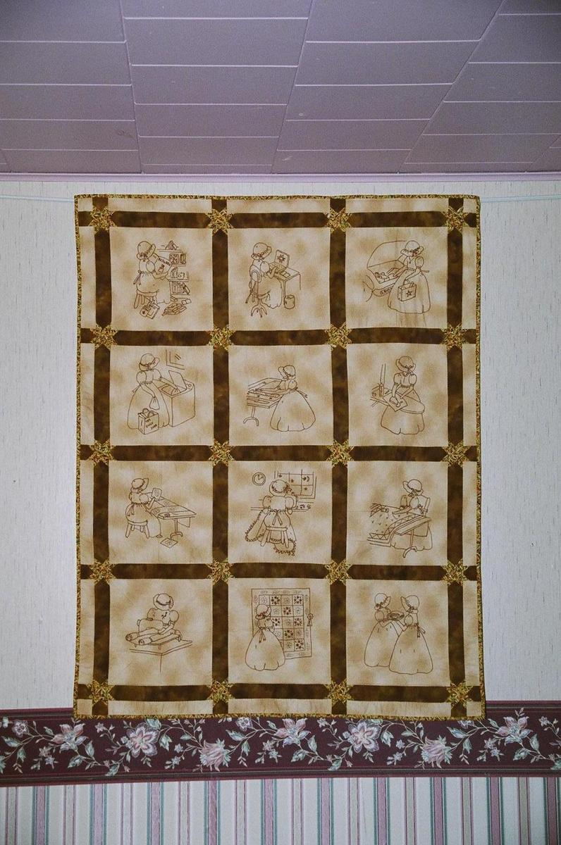 Even though I am a German living in England with no Sunbonnet Sue in my background, I have a little story: The subject of Sunbonnet Sue kept coming up when talking to one of my best quilting buddies (also a member here). She kept making really naughty suggestions how Sue could be brought up to date. I'm sure my friend mentioned pole dancing, and also Sue in full biking leathers, Sue joining a punk band, and various other interesting activities. So, when I had a little time I made a very traditional wallhanging for my friend that shows the two of us dressed up as Sunbonnet Sues. Here it is: