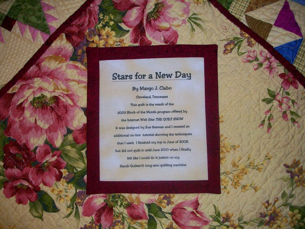 Barbara, I found a scrap with a selvage that says it's by RJR/ 2008, but there is no design number on the selvage. It was a wide backing fabric, so it's not pieced.Originally posted by bar7700Great label, Margo. A label is always an afterthought for me, if I even make one at all. I covet your backing fabric! Any chance you could share the name and maker of it?